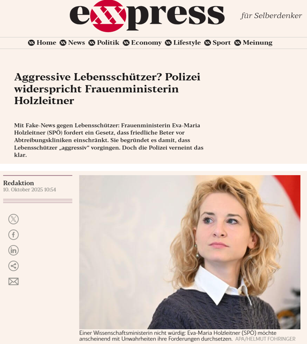 Für die diffamierende Aussage von Ministerin Holzleitner und die Berichterstattung des ORF fehlt jegliche Grundlage: Laut Landespolizeidirektion gibt es keinerlei Belege dafür, wonach die vor dem Bregenzer LKH betenden Lebensschützer bislang gesetzeswidrig aufgefallen wären - das berichtet Corrigenda in deren Beitrag vom 9.10.2025. Auf Nachfrage von Corrigenda gibt die Vorarlberger Landespolizeidirektion schriftlich bekannt, dass es zu keinem Zeitpunkt zu Gesetzwidrigkeiten seitens der Lebensschützer vor dem Bregenzer LKH gekommen ist.