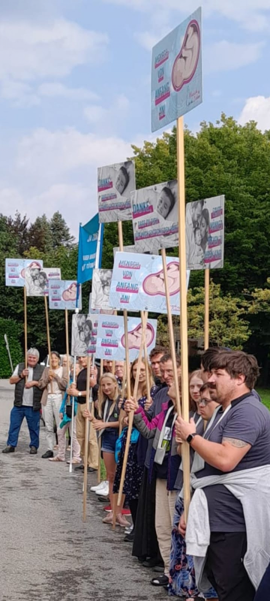 Um bei den dreimal wöchentlich stattfindenden Gebets-Mahnwachen weiterhin auf das Lebensrecht vorgeburtlicher Menschen hinzuweisen, werden zukünftig die Schilder mit lebensbejahenden Bildern und Texten mittels langer Stangen über die Wipfel der Thujen gehalten, sodass diese gut zu sehen sind.